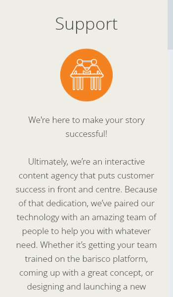 Ultimately, we’re an interactive content agency that puts customer success in front and centre. Because of that dedication, we’ve paired our technology with an amazing team of people to help you with whatever need. Whether it’s getting your team trained on the barisco platform, coming up with a great concept, or designing and launching a new content piece, we’re here to be your partner in success.