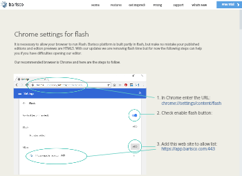 It is necessary to allow your browser to run Flash. Barisco platform is built partly in flash, but make no mistake your published editions and edtion previews are HTML5. With our updates we are removing flash time but for now the following steps can help you if you have difficulties opening our editor.